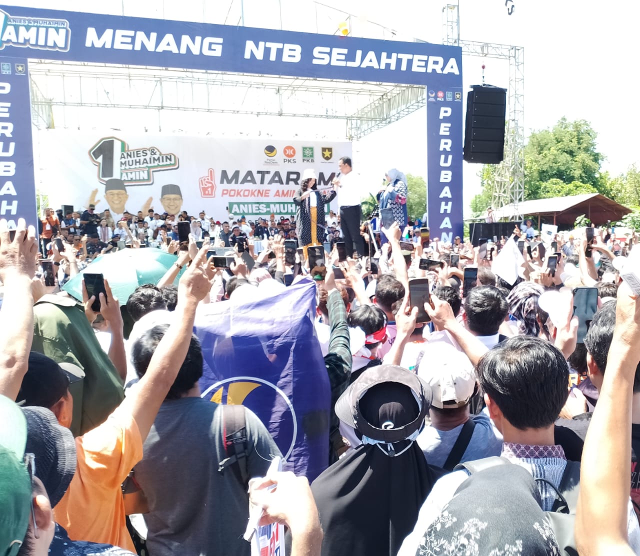 Anies Rasyid Baswedan hadir di Mataram tanpa calon wakilnya Muhaimin Iskandar. Karena di hari yang sama Muhaimin Iskandar sedang berkampanye di Banyuwangi Jawa Timur.