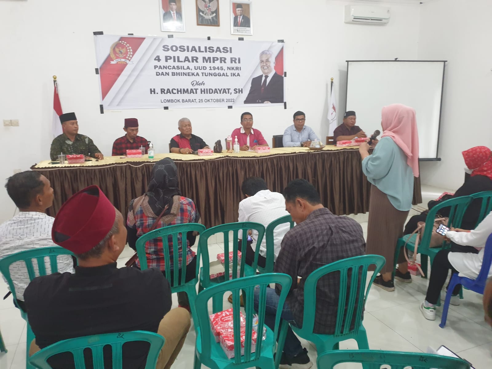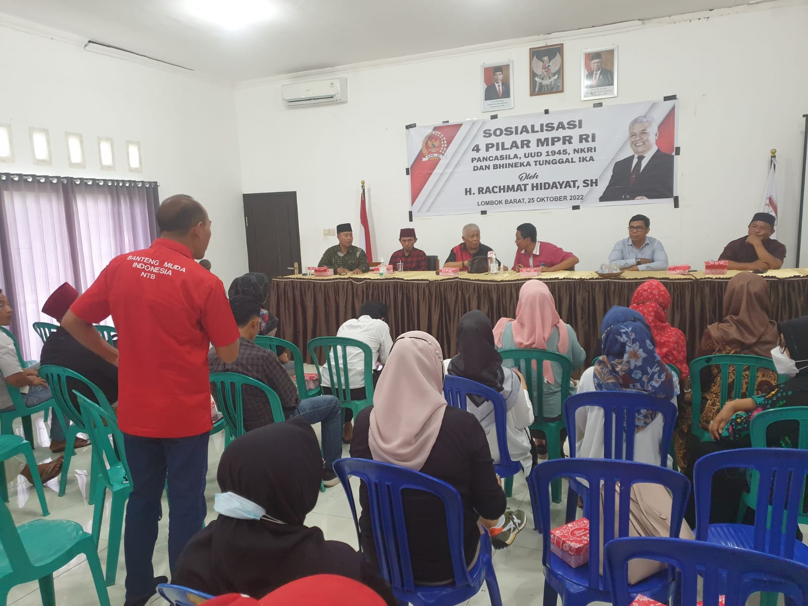 Lombok Barat – Anggota DPR RI dapil Lombok dari Fraksi PDI Perjuangan H. Rachmat Hidayat kembali menggelar sosialisasi Empat Pilar Kebangsaan. Kali ini, tokoh kharismatik Bumi Gora tersebut menggelorakan semangat Empat Pilar Kebangsaan yakni Pancasila, UUD 1945, Negara Kesatuan Republik Indonesia (NKRI), dan Bhinneka Tunggal Ika kepada para generasi muda di Lombok Barat.