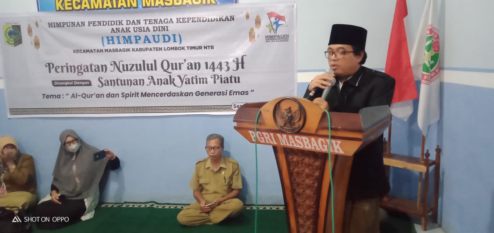 Lombok Timur – Bertempat di Aula Kantor UPTD Dikbud Kecamatan Masbagik, Pengurus Himpunan Pendidik dan Tenaga Kependidikan Usia Dini (HIMPAUDI) Kecamatan Masbagik Kabupaten Lombok Timur memperingati Nuzulul Qur’an yang dirangkai dengan Santunan 100 Anak Yatim Piatu, Senin (25/4).