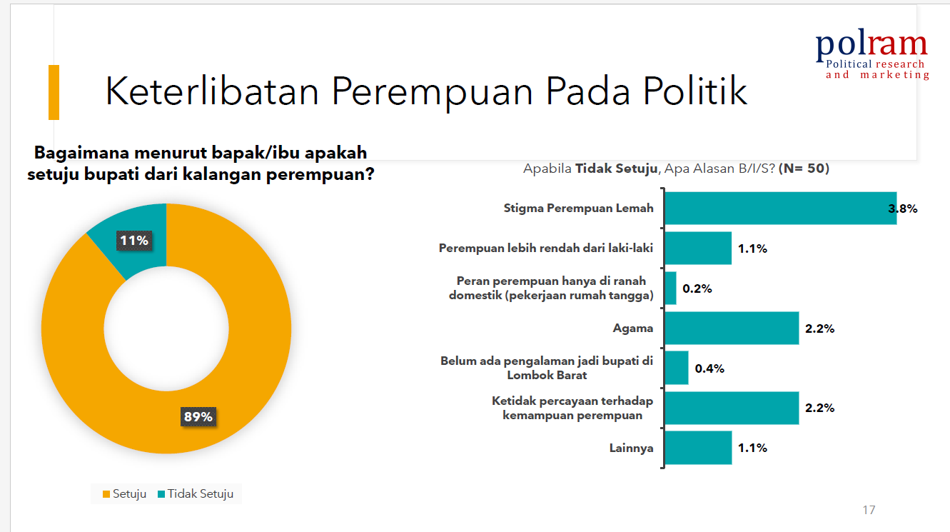 Selain itu Polram juga secara khusus menanyakan apakah responden setuju kalau Bupati dari kalangan Perempuan. Hasilnya, 89% setuju dan 11% tidak setuju. Dari kalangan yang tidak setuju (11%), ketika ditanyakan alasannya, sebanyak 3,8% menyatakan alasan stugma perempuan lemah. Selanjutnya, 2,2% karena alasan agama dan tidak percaya dengan kemampuan perempuan. Sisanya mengemukakan alasan yang berkaitan dengan pemahaman terhadap kesetaraan gender.