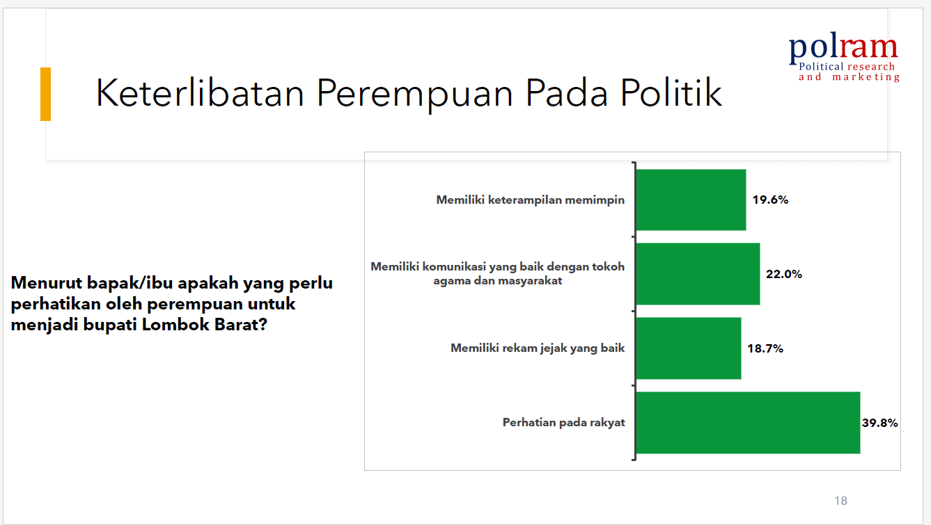 Walaupun tidak bisa menggambarkan populasi Nusa Tenggara Barat, namun hasil temuan Polram layak untuk dipertimbangkan sebagai acuan. Tentunya kalau memang Ummi Rohmi merasa sudah tidak cocok dengan pasangan sebelumnya saat Pilkada 2018-2023. Karena hasil temuan Polram menyatakan bahwa 39,8% responden menyatakan syarat Bupati dari kalangan perempuan adalah perhatian pada rakyat. Selanjutnya, 22% responden menempatkan komunikasi yang baik dengan tokoh agama dan masyarakat. Sedangkan 19.6% yang perlu diperhatikan oleh pemimpin perempuan adalah keterampilan memimpin. Serta yang terakhir adalah yang perlu diperhatikan yaitu memiliki rekam jejak yang baik.